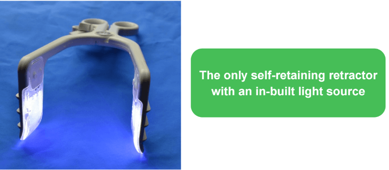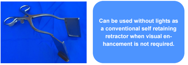 Oplight S ™The Oplight S combines a conventional self-retaining retractor with an add in light source. It directly illuminates the surgical cavity while holding open the incision. The unit comprises of a stainless steel reusable base and an LED light source cartridge which is disposed of after a single use. The Clinical ChallengeTraditional overhead lighting systems or head mounted fibre optic systems have limitations and are sometimes inadequate for surgery in deeper cavities where shadowing can be an issue and localised illumination may be required. Such systems can limit mobility due to cables or can be associated with head and neck fatigue for frequent or prolonged use. The Oplight S provides the solution by